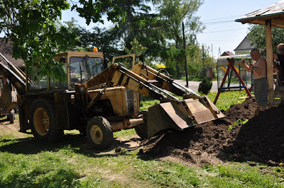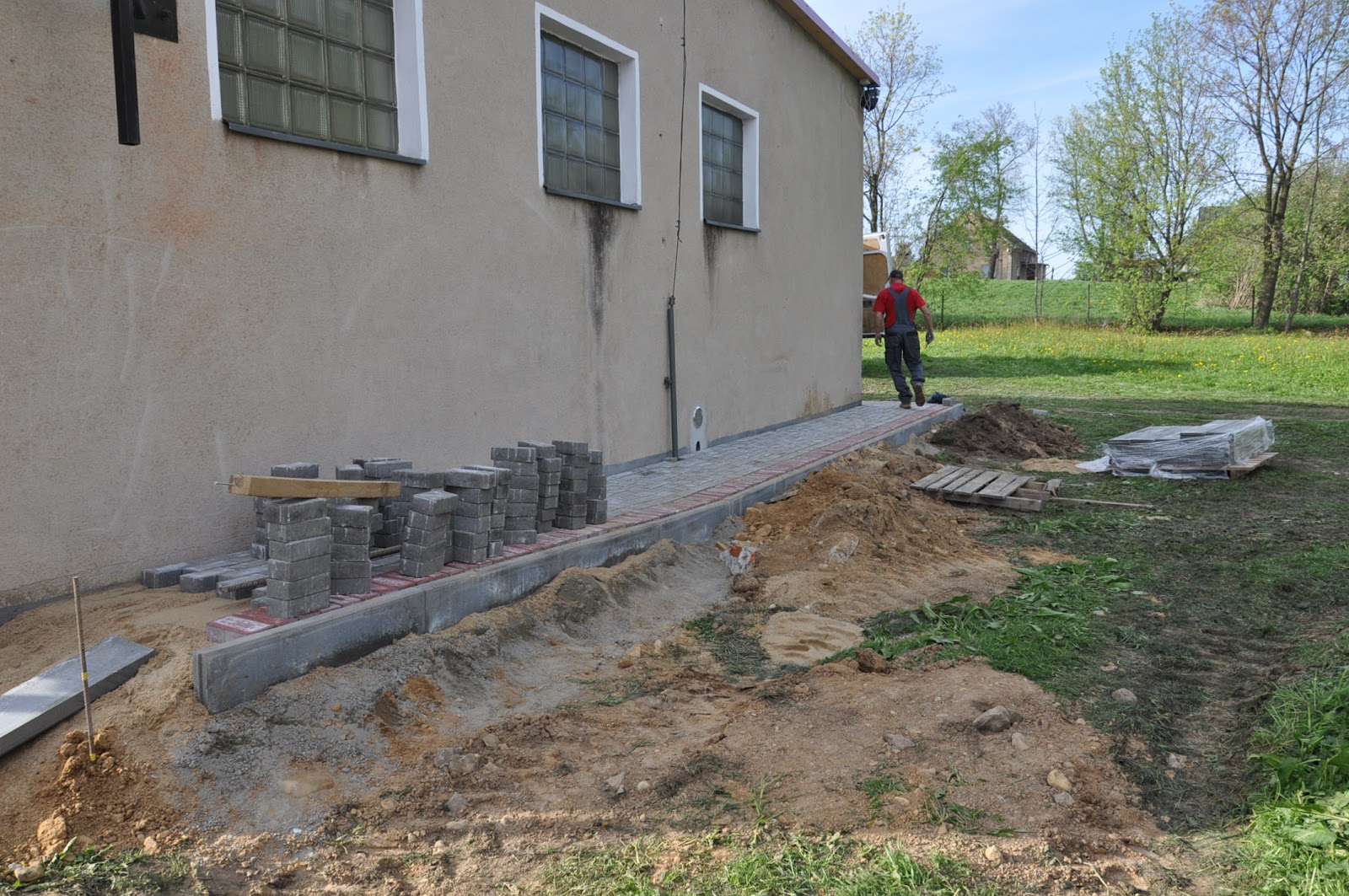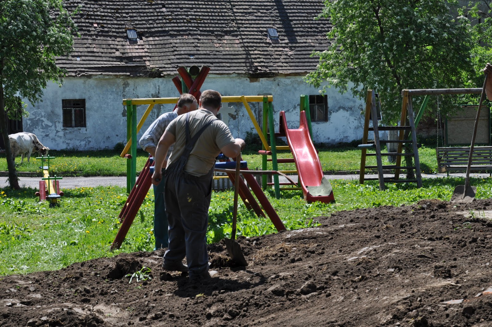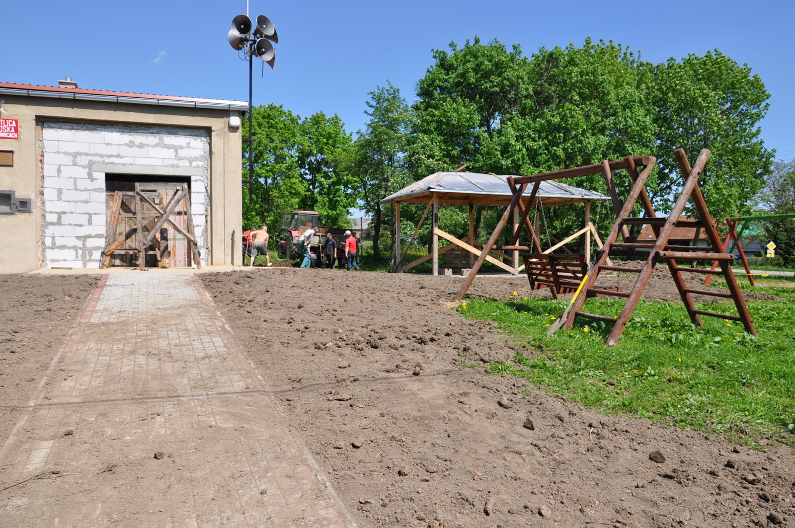 Następnie została nawieziona ziemia w celu wyrównania terenu wokół nowych chodników.Sołtys Mieczysław Łętocha zorganizował mieszkańców,którzy przyszli rozplantować i wyrównać ziemię pod zasiew młodej trawy.