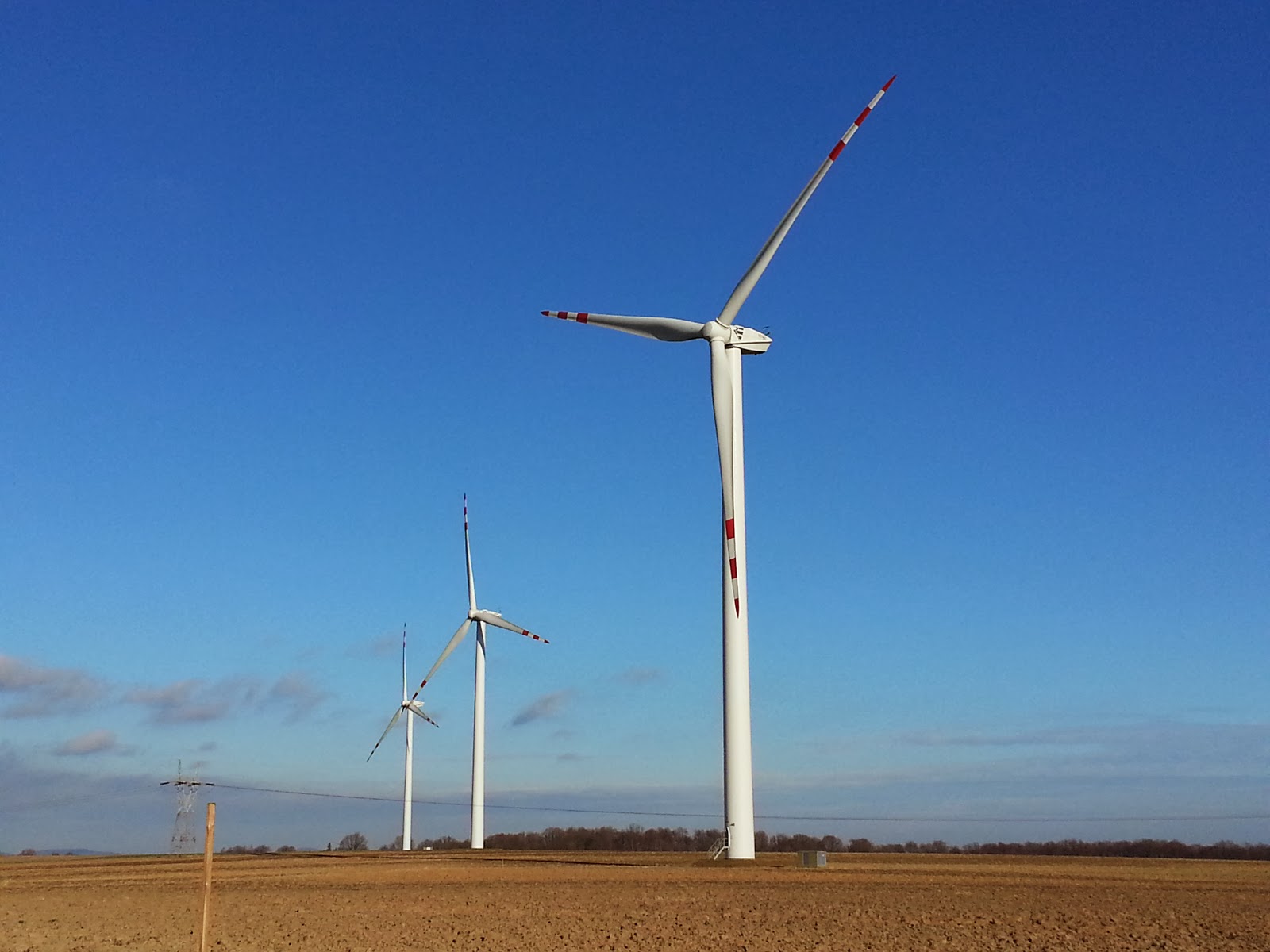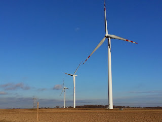 Po blisko godzinnej podróży wygodnym , nowo zakupionym przez Gminę autobusem , w oddali naszym oczom ukazały się pięknie komponujące się z krajobrazem , kręcące się turbiny wiatraków.